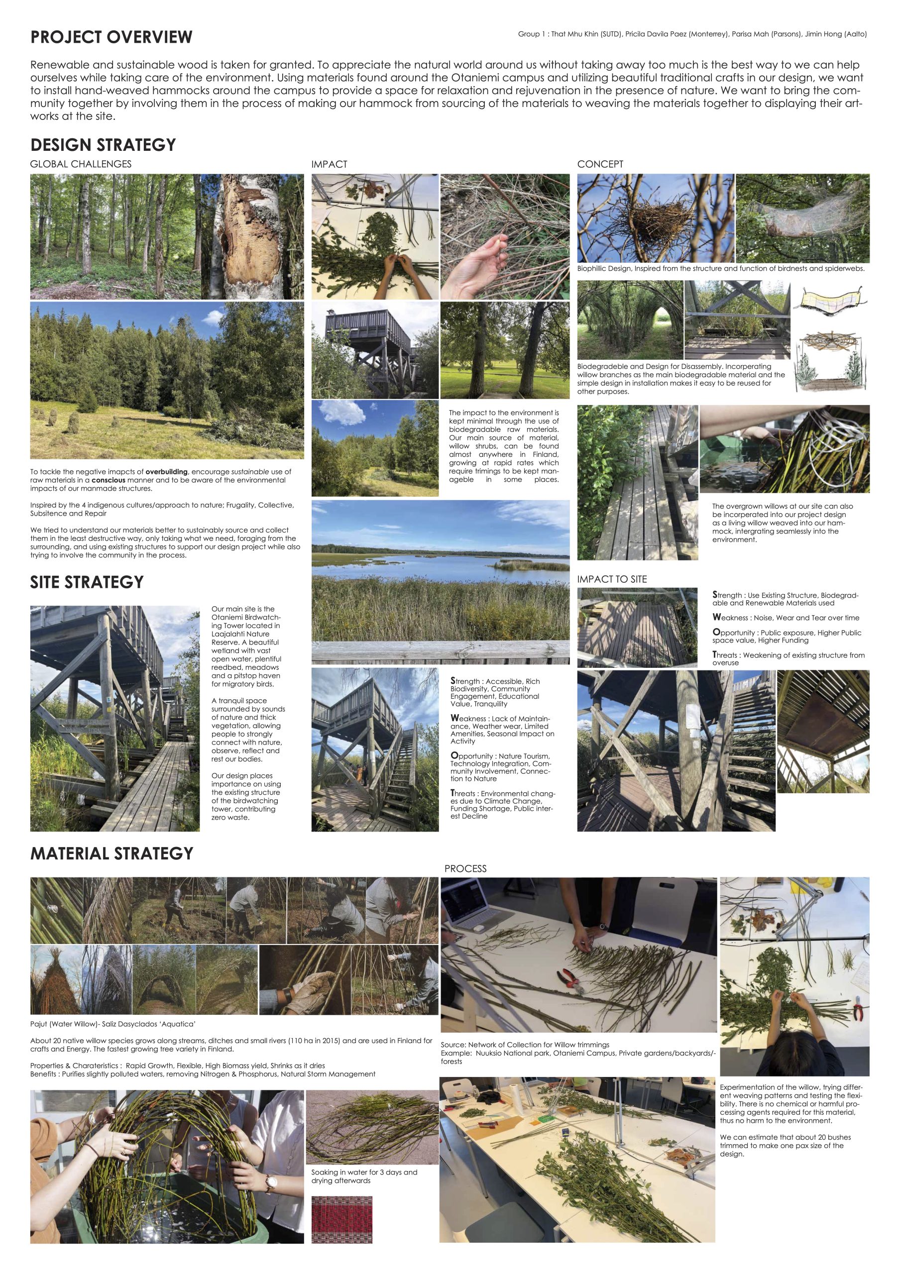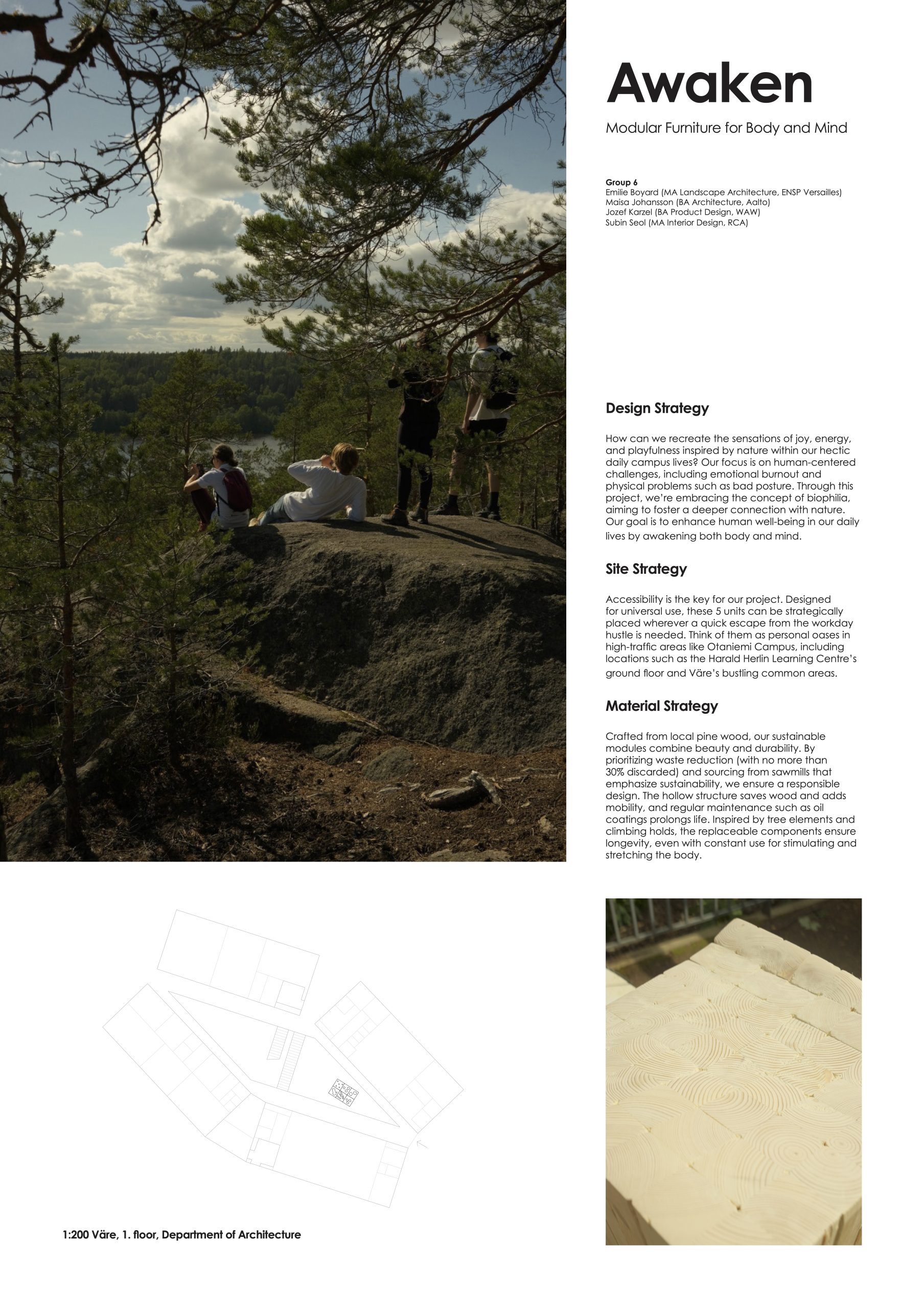 Summer school course Living with wood(s) (6ECTS) is a two-week intensive course studying the use of wood in designing living environments in balance with the nature. Forty-three students from ten universities around the world collaborated to produce design proposals for wood-based living spaces on the Otaniemi campus. The mission of the course was to explore sustainable ways to use forest both i their natural form and as an industrial resource, while promoting the well-being of humans and other species.
