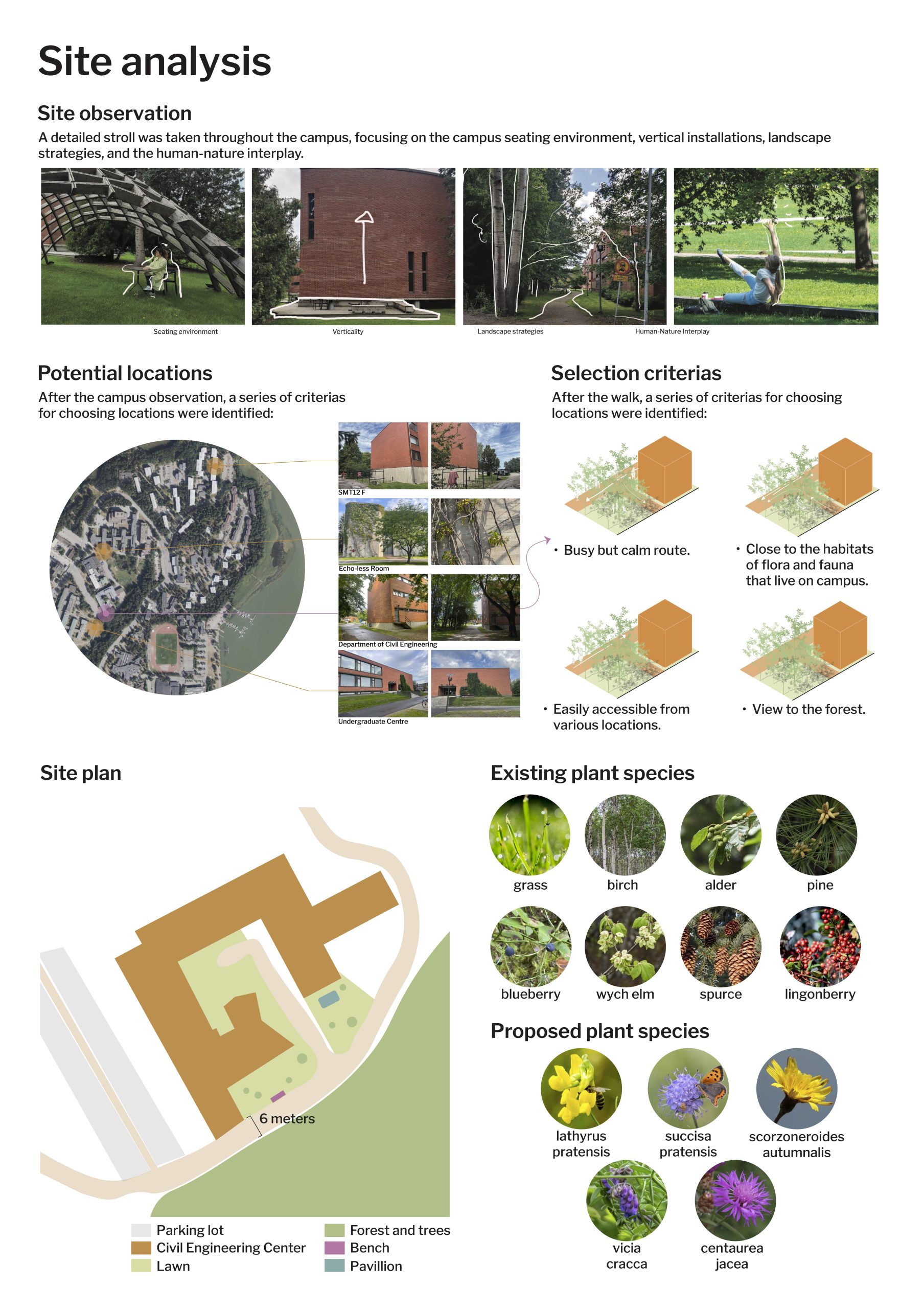 The student groups will produce new living environments to the Otaniemi campus. The students can define their own approach to living environments: are the spaces designed for humans or other species? The students will select their own site that they will focus on. The students will define the boundaries of the site where their design interventions are placed.