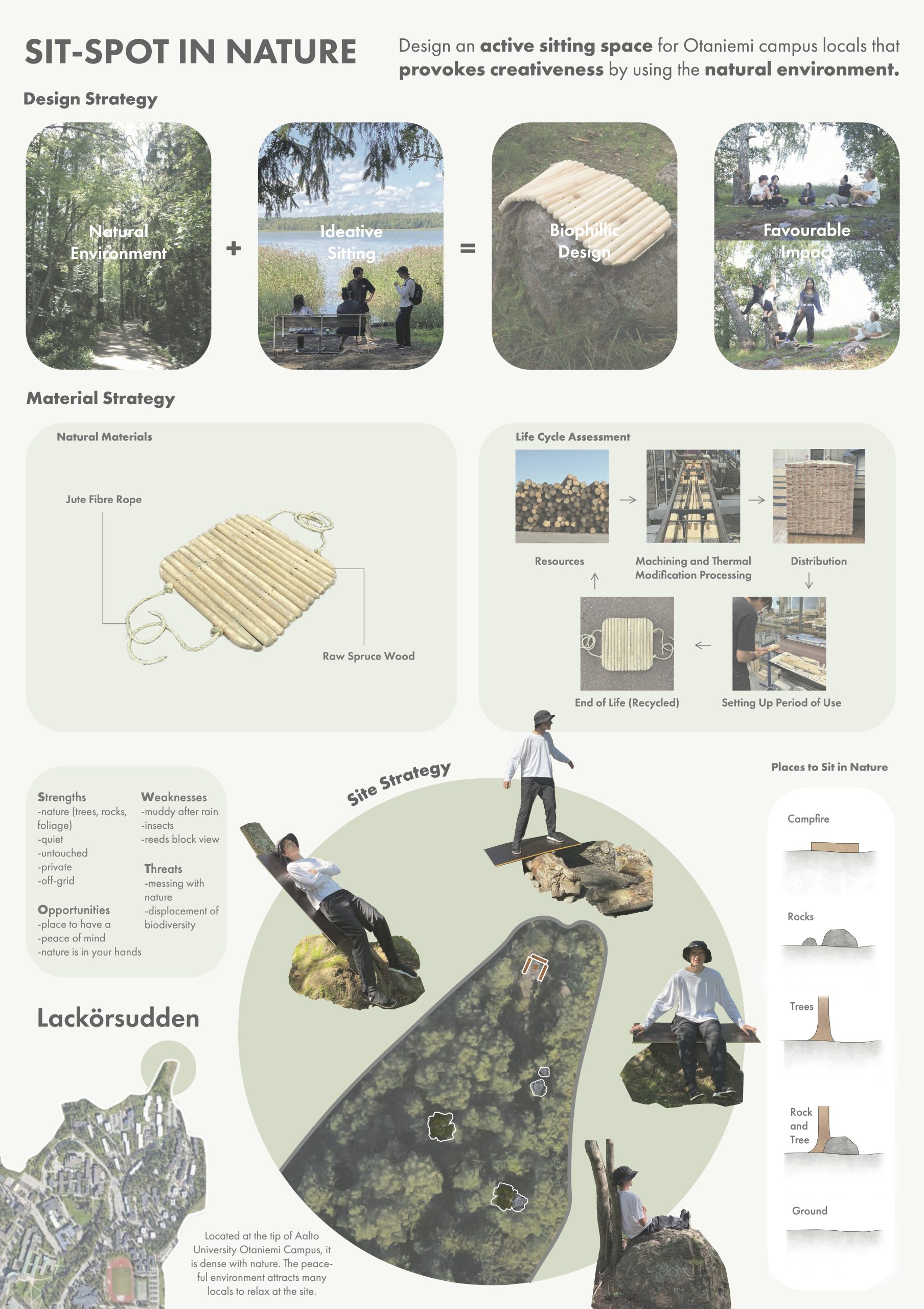The mid scale considers a selected site on the campus. The scale can focus for example on a building or a structure and its immediate surroundings. The smallest scale focuses on details, interior architecture, furniture design or products. In this scale the students can present details of structures or one to one mockups of products for example. Each group determines how much they focus on each scale, but all three scales should be considered in the final design proposal.